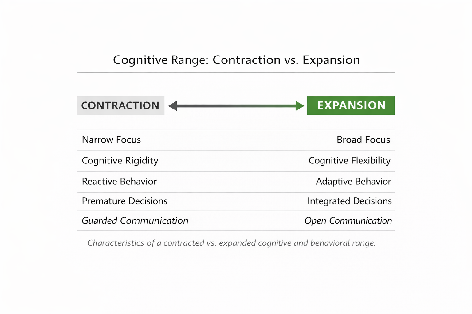 The distinction between expansion and contraction is grounded in well-established research across neuroscience, cognitive psychology, and organizational behavior. These fields converge on a consistent finding: the conditions under which individuals operate directly influence their cognitive range and behavioral flexibility.